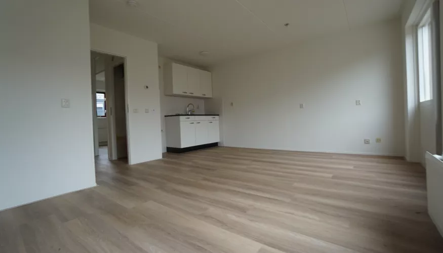 Je woont in een appartement met een woonkamer met keuken, aparte slaapkamer en een badkamer op de begane grond met een tuintje.