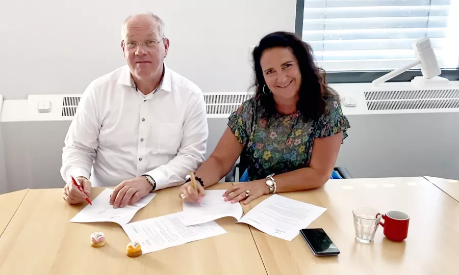 Foto: Peter van Wijk, bestuurder Profila Zorggroep en Arina Kruithof, bestuurder Syndion, tekenen voor samenwerking in het behandelen van cliënten.